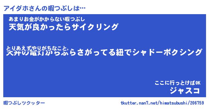 アイダホさんの暇つぶしは… とりあえずやりがちなこと『天井の電灯からぶらさがってる紐でシャドーボクシング』あまりお金がかからない暇つぶし『天気が良かったらサイクリング』ここに行っとけばOK『ジャスコ』 ツクッター #暇つぶしツクッター http://tkutter.nan7.net/himatsubushi/206759/
