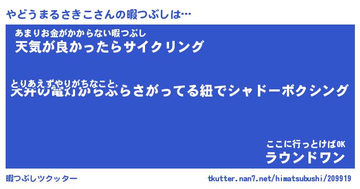 | ツイッター | やどうまるさきこさんのツイッターID『dendenmushi_nyan』 |