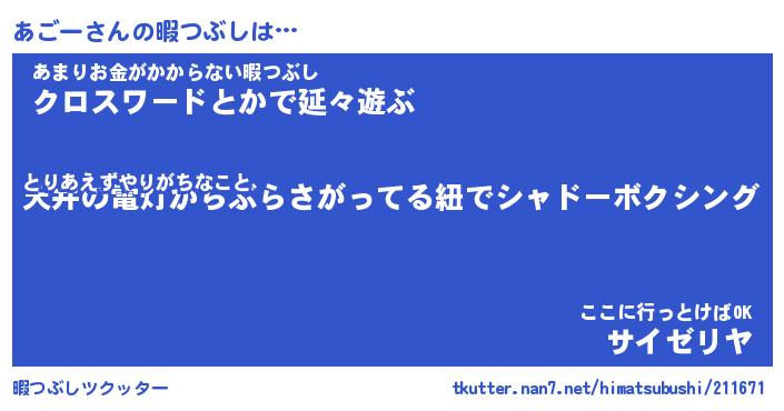 あごーさんの暇つぶしは… とりあえずやりがちなこと『天井の電灯からぶらさがってる紐でシャドーボクシング』あまりお金がかからない暇つぶし『クロスワードとかで延々遊ぶ』ここに行っとけばOK『サイゼリヤ』 ツクッター #暇つぶしツクッター http://tkutter.nan7.net/himatsubushi/211671/