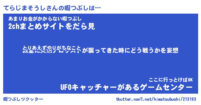 てらじまそうしさんの暇つぶしは… とりあえずやりがちなこと『教室に突然テロリストが襲ってきた時にどう戦うかを妄想』あまりお金がかからない暇つぶし『2chまとめサイトをだら見』ここに行っとけばOK『UFOキャッチャーがあるゲームセンター』 ツクッター #暇つぶしツクッター http://tkutter.nan7.net/himatsubushi/213163/