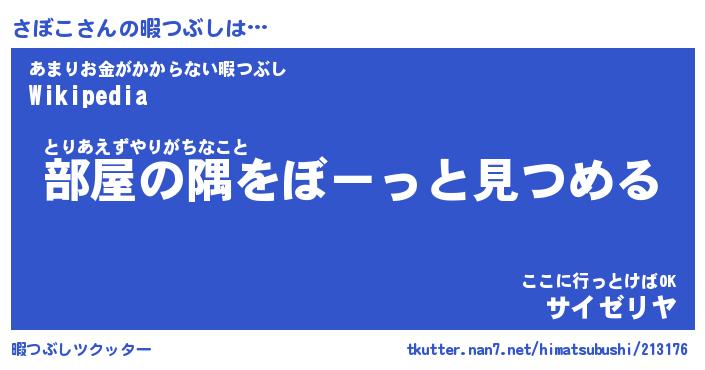 さぼこさんの暇つぶしは… とりあえずやりがちなこと『部屋の隅をぼーっと見つめる』あまりお金がかからない暇つぶし『Wikipedia』ここに行っとけばOK『サイゼリヤ』 ツクッター #暇つぶしツクッター http://tkutter.nan7.net/himatsubushi/213176/
