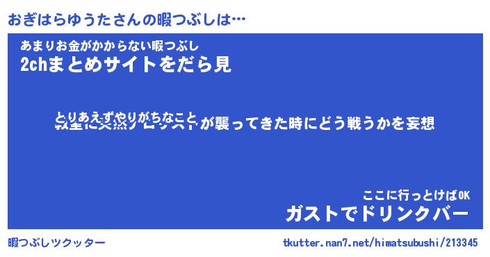 おぎはらゆうたさんの暇つぶしは… とりあえずやりがちなこと『教室に突然テロリストが襲ってきた時にどう戦うかを妄想』あまりお金がかからない暇つぶし『2chまとめサイトをだら見』ここに行っとけばOK『ガストでドリンクバー』 ツクッター #暇つぶしツクッター http://tkutter.nan7.net/himatsubushi/213345/
