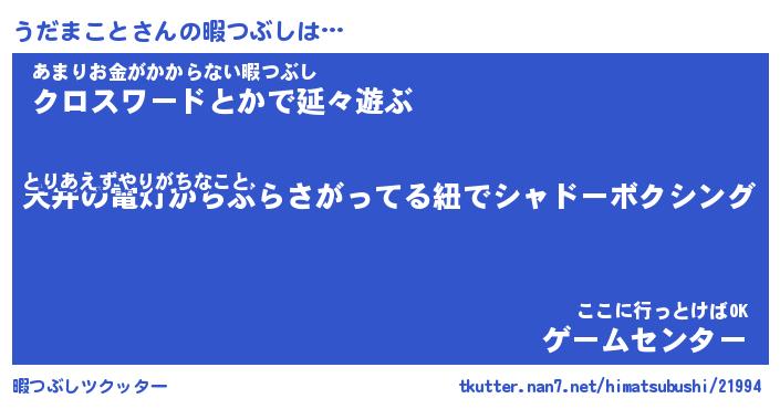 うだまことさんの暇つぶしは… とりあえずやりがちなこと『天井の電灯からぶらさがってる紐でシャドーボクシング』あまりお金がかからない暇つぶし『クロスワードとかで延々遊ぶ』ここに行っとけばOK『ゲームセンター』 ツクッター #暇つぶしツクッター http://tkutter.nan7.net/himatsubushi/21994/