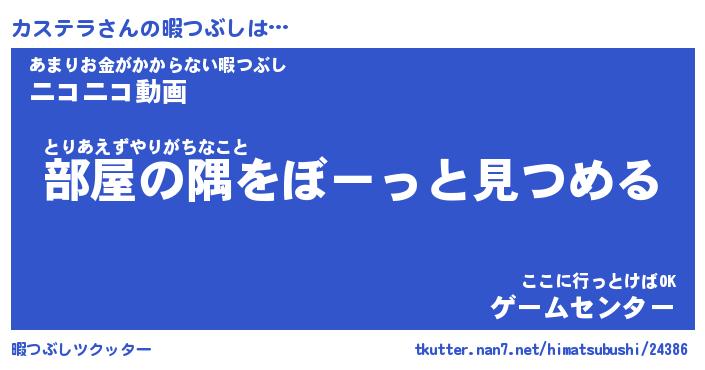 カステラさんの暇つぶしは… とりあえずやりがちなこと『部屋の隅をぼーっと見つめる』あまりお金がかからない暇つぶし『ニコニコ動画』ここに行っとけばOK『ゲームセンター』 ツクッター #暇つぶしツクッター http://tkutter.nan7.net/himatsubushi/24386/