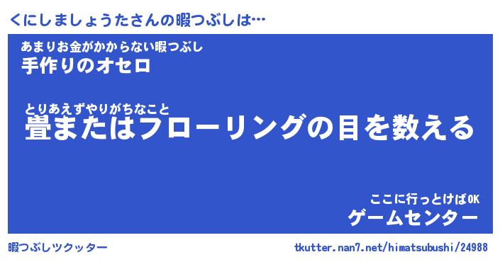 くにしましょうたさんの暇つぶしは… とりあえずやりがちなこと『畳またはフローリングの目を数える』あまりお金がかからない暇つぶし『手作りのオセロ』ここに行っとけばOK『ゲームセンター』 ツクッター #暇つぶしツクッター http://tkutter.nan7.net/himatsubushi/24988/