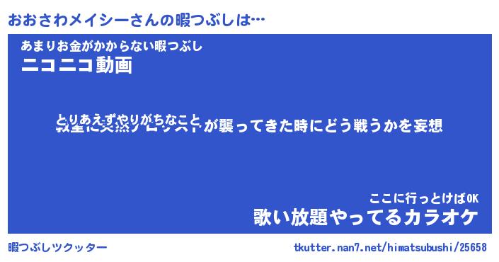 おおさわメイシーさんの暇つぶしは… とりあえずやりがちなこと『教室に突然テロリストが襲ってきた時にどう戦うかを妄想』あまりお金がかからない暇つぶし『ニコニコ動画』ここに行っとけばOK『歌い放題やってるカラオケ』 ツクッター #暇つぶしツクッター http://tkutter.nan7.net/himatsubushi/25658/