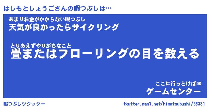 はしもとしょうごさんの暇つぶしは… とりあえずやりがちなこと『畳またはフローリングの目を数える』あまりお金がかからない暇つぶし『天気が良かったらサイクリング』ここに行っとけばOK『ゲームセンター』 ツクッター #暇つぶしツクッター http://tkutter.nan7.net/himatsubushi/36381/