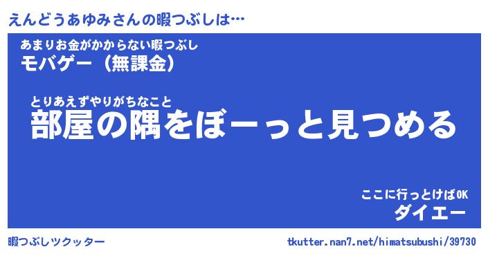 えんどうあゆみさんの暇つぶしは… とりあえずやりがちなこと『部屋の隅をぼーっと見つめる』あまりお金がかからない暇つぶし『モバゲー(無課金)』ここに行っとけばOK『ダイエー』 ツクッター #暇つぶしツクッター http://tkutter.nan7.net/himatsubushi/39730/