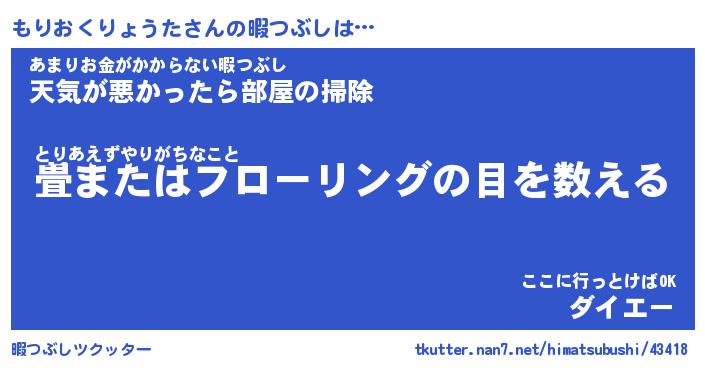 もりおくりょうたさんの暇つぶしは… とりあえずやりがちなこと『畳またはフローリングの目を数える』あまりお金がかからない暇つぶし『天気が悪かったら部屋の掃除』ここに行っとけばOK『ダイエー』 ツクッター #暇つぶしツクッター http://tkutter.nan7.net/himatsubushi/43418/