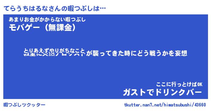 | 男性向けラノベタイトル風あだ名 | 『テラウチハルナアートオンライン』 |