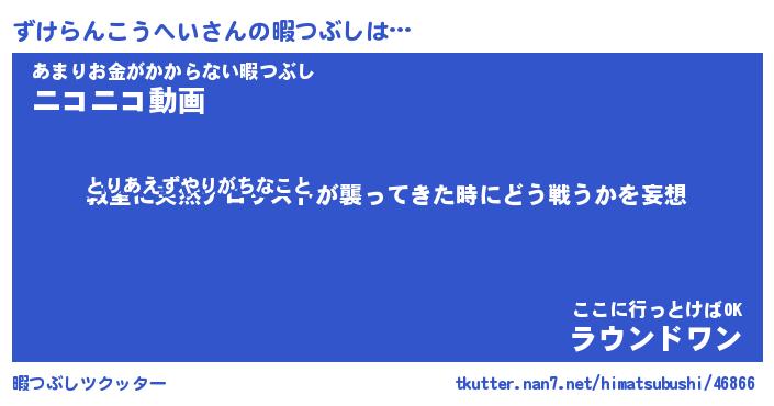 ずけらんこうへいさんの暇つぶしは… とりあえずやりがちなこと『教室に突然テロリストが襲ってきた時にどう戦うかを妄想』あまりお金がかからない暇つぶし『ニコニコ動画』ここに行っとけばOK『ラウンドワン』 ツクッター #暇つぶしツクッター http://tkutter.nan7.net/himatsubushi/46866/