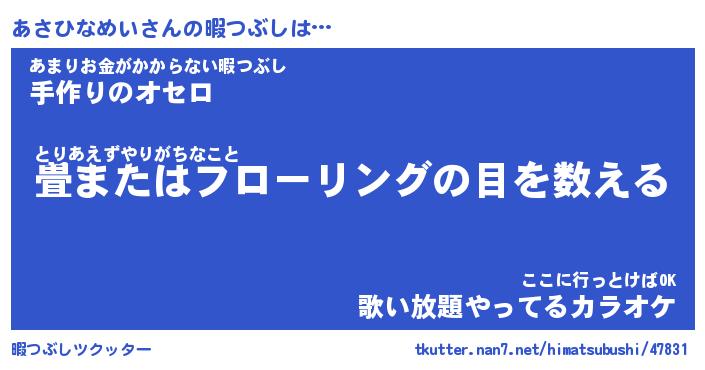 | ヒーロー風カッコイイあだ名 | 『スーパーアサヒナメイ』『銀牙騎士アサ』 |