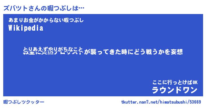 ズバツトさんの暇つぶしは… とりあえずやりがちなこと『教室に突然テロリストが襲ってきた時にどう戦うかを妄想』あまりお金がかからない暇つぶし『Wikipedia』ここに行っとけばOK『ラウンドワン』 ツクッター #暇つぶしツクッター http://tkutter.nan7.net/himatsubushi/53669/