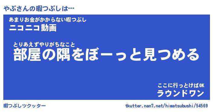 やぶさんの暇つぶしは… とりあえずやりがちなこと『部屋の隅をぼーっと見つめる』あまりお金がかからない暇つぶし『ニコニコ動画』ここに行っとけばOK『ラウンドワン』 ツクッター #暇つぶしツクッター http://tkutter.nan7.net/himatsubushi/54569/