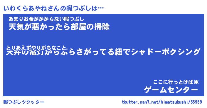 | 男性向けラノベタイトル風あだ名 | 『イワクラアヤネアートオンライン』 |