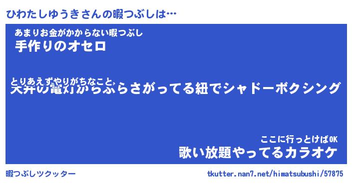 ひわたしゆうきさんの暇つぶしは… とりあえずやりがちなこと『天井の電灯からぶらさがってる紐でシャドーボクシング』あまりお金がかからない暇つぶし『手作りのオセロ』ここに行っとけばOK『歌い放題やってるカラオケ』 ツクッター #暇つぶしツクッター http://tkutter.nan7.net/himatsubushi/57875/