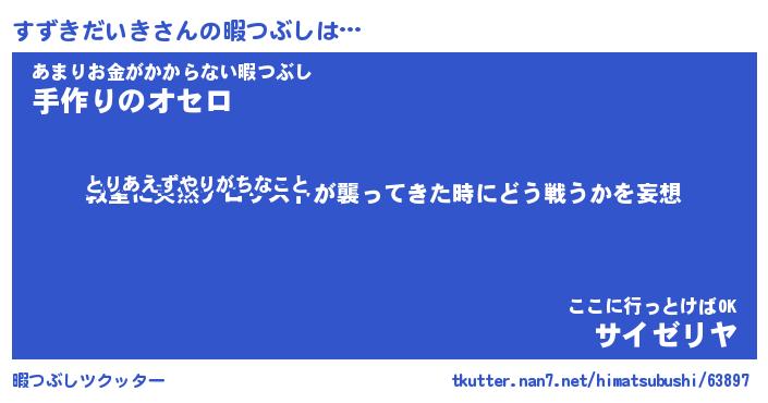 すずきだいきさんの暇つぶしは… とりあえずやりがちなこと『教室に突然テロリストが襲ってきた時にどう戦うかを妄想』あまりお金がかからない暇つぶし『手作りのオセロ』ここに行っとけばOK『サイゼリヤ』 ツクッター #暇つぶしツクッター http://tkutter.nan7.net/himatsubushi/63897/