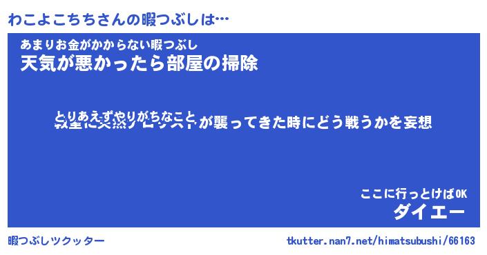わこよこちちさんの暇つぶしは… とりあえずやりがちなこと『教室に突然テロリストが襲ってきた時にどう戦うかを妄想』あまりお金がかからない暇つぶし『天気が悪かったら部屋の掃除』ここに行っとけばOK『ダイエー』 ツクッター #暇つぶしツクッター http://tkutter.nan7.net/himatsubushi/66163/