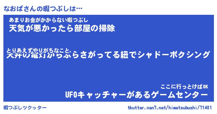 なおばさんの暇つぶしは… とりあえずやりがちなこと『天井の電灯からぶらさがってる紐でシャドーボクシング』あまりお金がかからない暇つぶし『天気が悪かったら部屋の掃除』ここに行っとけばOK『UFOキャッチャーがあるゲームセンター』 ツクッター #暇つぶしツクッター http://tkutter.nan7.net/himatsubushi/71401/