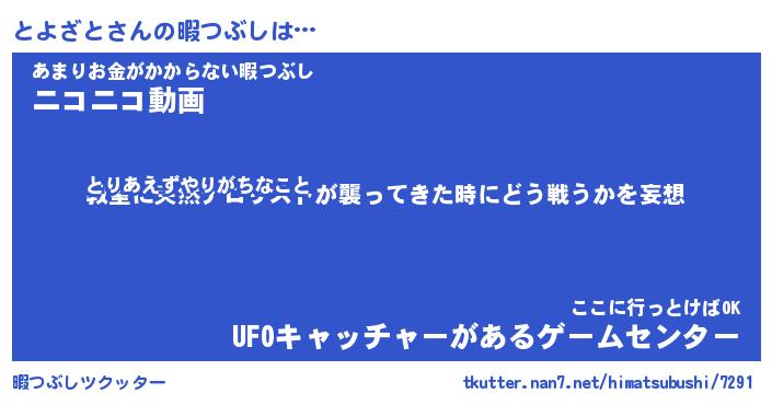 とよざとさんの暇つぶしは… とりあえずやりがちなこと『教室に突然テロリストが襲ってきた時にどう戦うかを妄想』あまりお金がかからない暇つぶし『ニコニコ動画』ここに行っとけばOK『UFOキャッチャーがあるゲームセンター』 ツクッター #暇つぶしツクッター http://tkutter.nan7.net/himatsubushi/7291/