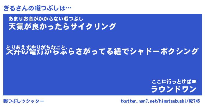 ぎるさんの暇つぶしは… とりあえずやりがちなこと『天井の電灯からぶらさがってる紐でシャドーボクシング』あまりお金がかからない暇つぶし『天気が良かったらサイクリング』ここに行っとけばOK『ラウンドワン』 ツクッター #暇つぶしツクッター http://tkutter.nan7.net/himatsubushi/82745/