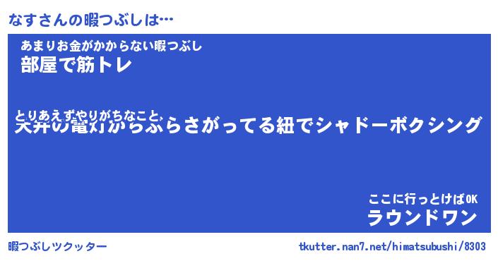 なすさんの暇つぶしは… とりあえずやりがちなこと『天井の電灯からぶらさがってる紐でシャドーボクシング』あまりお金がかからない暇つぶし『部屋で筋トレ』ここに行っとけばOK『ラウンドワン』 ツクッター #暇つぶしツクッター http://tkutter.nan7.net/himatsubushi/8303/