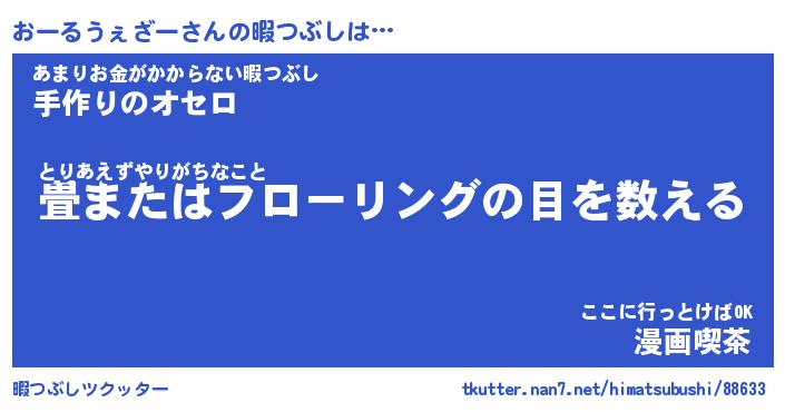 おーるうぇざーさんの暇つぶしは… とりあえずやりがちなこと『畳またはフローリングの目を数える』あまりお金がかからない暇つぶし『手作りのオセロ』ここに行っとけばOK『漫画喫茶』 ツクッター #暇つぶしツクッター http://tkutter.nan7.net/himatsubushi/88633/