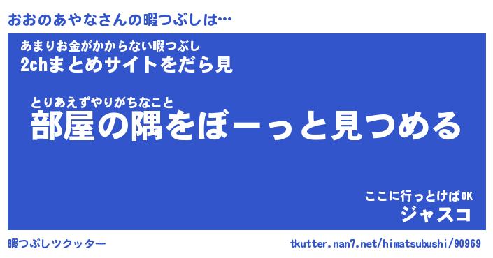 おおのあやなさんの暇つぶしは… とりあえずやりがちなこと『部屋の隅をぼーっと見つめる』あまりお金がかからない暇つぶし『2chまとめサイトをだら見』ここに行っとけばOK『ジャスコ』 ツクッター #暇つぶしツクッター http://tkutter.nan7.net/himatsubushi/90969/