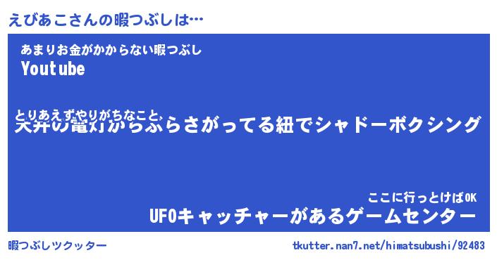 えびあこさんの暇つぶしは… とりあえずやりがちなこと『天井の電灯からぶらさがってる紐でシャドーボクシング』あまりお金がかからない暇つぶし『Youtube』ここに行っとけばOK『UFOキャッチャーがあるゲームセンター』 ツクッター #暇つぶしツクッター http://tkutter.nan7.net/himatsubushi/92483/