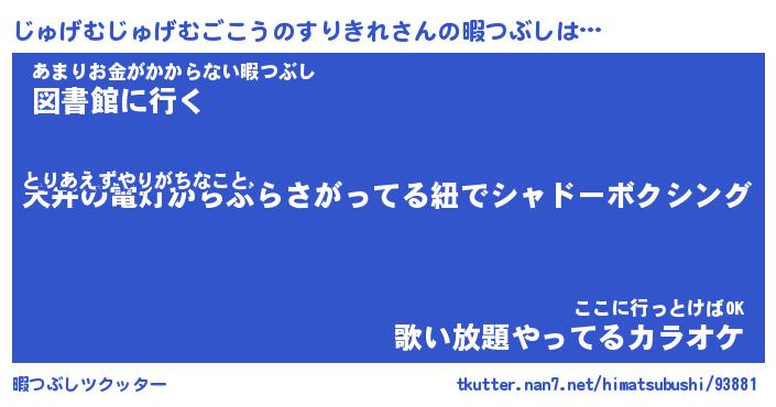 | 男性向けラノベタイトル風あだ名 | 『ジュゲムジュゲムゴコウノスリキレアートオンライン』 |