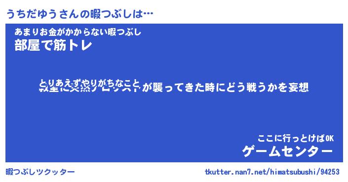 うちだゆうさんの暇つぶしは… とりあえずやりがちなこと『教室に突然テロリストが襲ってきた時にどう戦うかを妄想』あまりお金がかからない暇つぶし『部屋で筋トレ』ここに行っとけばOK『ゲームセンター』 ツクッター #暇つぶしツクッター http://tkutter.nan7.net/himatsubushi/94253/
