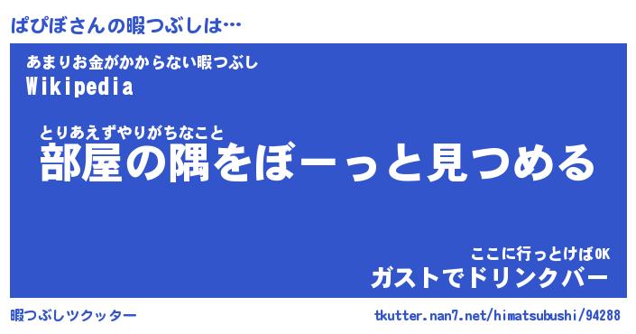 ぱぴぼさんの暇つぶしは… とりあえずやりがちなこと『部屋の隅をぼーっと見つめる』あまりお金がかからない暇つぶし『Wikipedia』ここに行っとけばOK『ガストでドリンクバー』 ツクッター #暇つぶしツクッター http://tkutter.nan7.net/himatsubushi/94288/