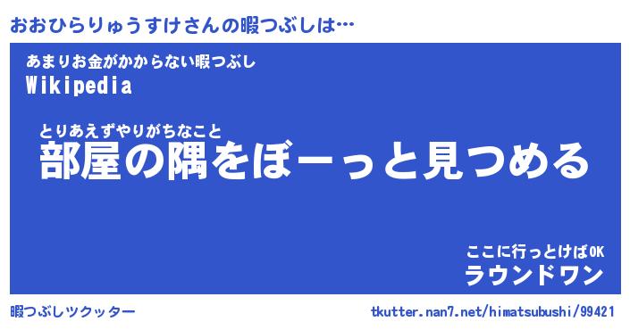 おおひらりゅうすけさんの暇つぶしは… とりあえずやりがちなこと『部屋の隅をぼーっと見つめる』あまりお金がかからない暇つぶし『Wikipedia』ここに行っとけばOK『ラウンドワン』 ツクッター #暇つぶしツクッター http://tkutter.nan7.net/himatsubushi/99421/