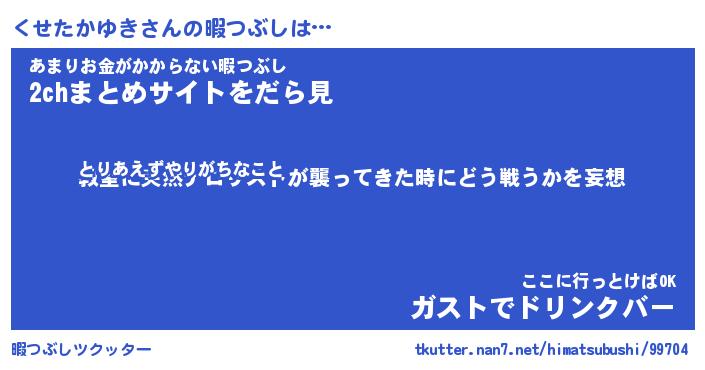 くせたかゆきさんの暇つぶしは… とりあえずやりがちなこと『教室に突然テロリストが襲ってきた時にどう戦うかを妄想』あまりお金がかからない暇つぶし『2chまとめサイトをだら見』ここに行っとけばOK『ガストでドリンクバー』 ツクッター #暇つぶしツクッター http://tkutter.nan7.net/himatsubushi/99704/