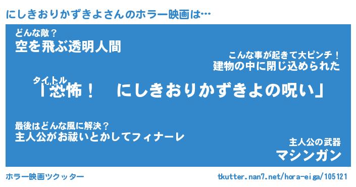 | 男性向けラノベタイトル風あだ名 | 『にしきおりかずきよの憂鬱』 |