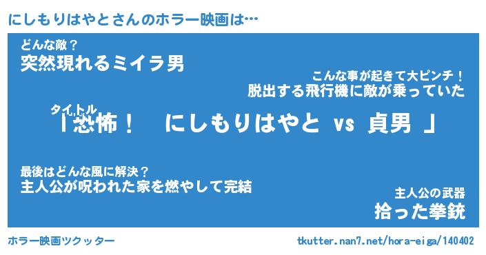 | 男性向けラノベタイトル風あだ名 | 『にしもりはやとの憂鬱』 |