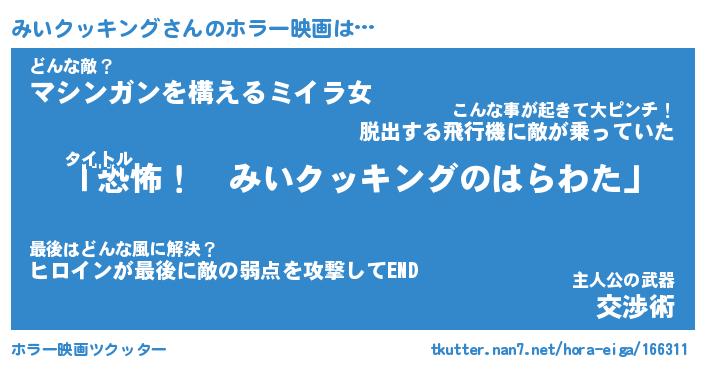 | 男性向けラノベタイトル風あだ名 | 『みいクッキングの憂鬱』 |