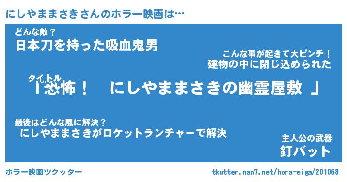 | 男性向けラノベタイトル風あだ名 | 『にしやままさきの憂鬱』 |