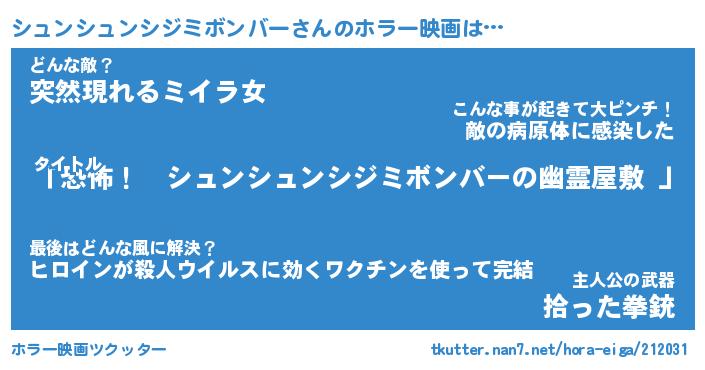 | 男性向けラノベタイトル風あだ名 | 『シュンシュンシジミボンバーの憂鬱』 |