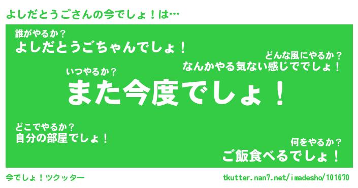 | ヒーロー風カッコイイあだ名 | 『スーパーヨシダトウゴ』『天弓騎士ヨシ』 |