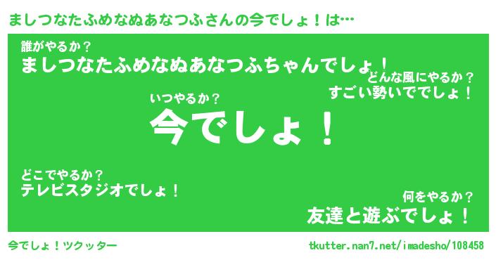 | ツイッター | ましつなたふめなぬあなつふさんのツイッターID『renkon_nyan』 |