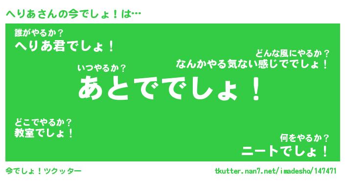 | ヘコむあだ名 | 『へりもー』『なまこ酢』『へり太郎』 |
