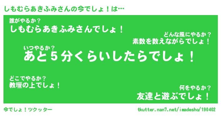 | 肩書あだ名 | 『しもむらあきふみ御曹司』 |