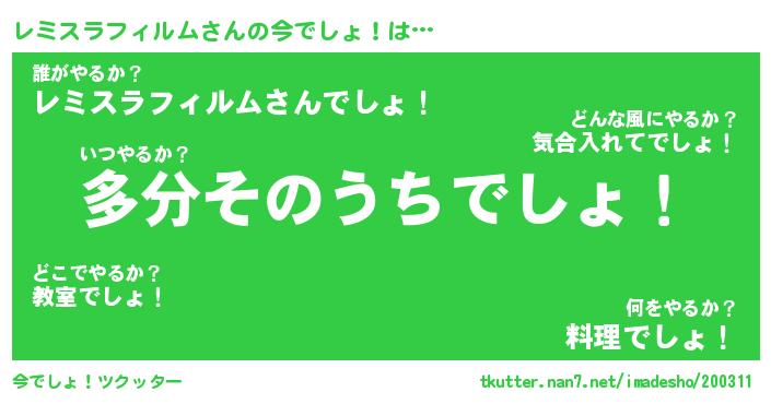 | 料理風あだ名 | 『節約★レミスラフィルムと油揚げの玉子丼』 |