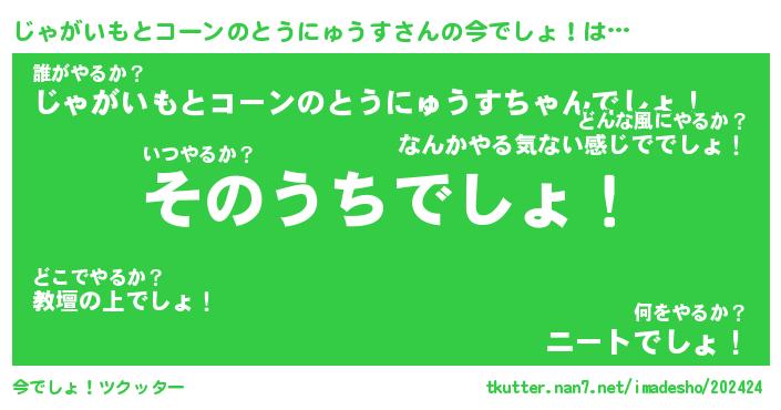 | 番長 | じゃがいもとコーンのとうにゅうす、またの名を・・・!『だっちゅーのじゃがいもとコーンのとうにゅうすっち』 |