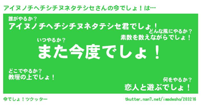 | ツイッター | アイヌノチヘチシチヌネタテシセさんのツイッターID『fukuyoka_man』 |