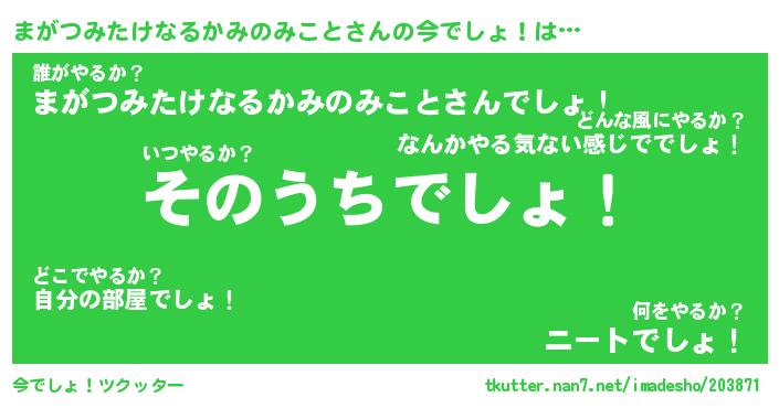 | 女子向けラノベタイトル風あだ名 | 『(仮)まがつみたけなるかみのみことのやんごとなき事情』 |