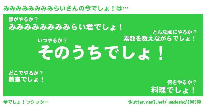 女子向けラノベタイトル風あだ名 | 『(仮)みみみみみみみみらいのやんごとなき事情』 |