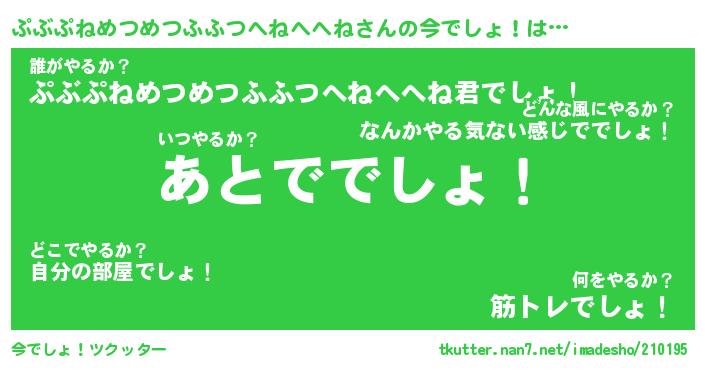 | 料理風あだ名 | 『節約★ぷぶぷねめつめつふふつへねへへねと油揚げの玉子丼』 |