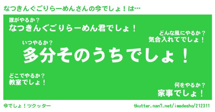 | 男性向けラノベタイトル風あだ名 | 『なつきんぐごりらーめんの憂鬱』 |